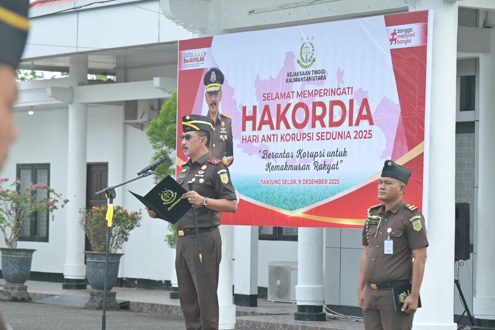 IKaeN.id, TANJUNG SELOR – Kejaksaan Tinggi (Kejati) Kalimantan Utara (Kaltara) menggelar upacara puncak peringatan Hari Anti Korupsi Sedunia (Hakordia) Tahun 2025, Selasa (9/12/2025) di Tanjung Selor. Upacara dipimpin langsung oleh Kepala Kejaksaan Tinggi (Kajati) Kaltara, Yudi Indra Gunawan, S.H., M.H.