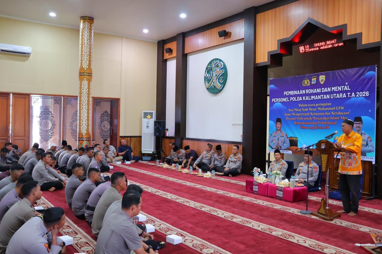 IKaeN.id, TANJUNG SELOR – Dengan tema “Memperteguh Keimanan dan Ketakwaan Personel Polri untuk Masyarakat dalam Aksi Kemanusiaan dan Peduli Sosial Tahun 2026”, Polda Kalimantan Utara (Kaltara) melaksanakan peringatan Isra Mikraj Nabi Muhammad SAW di Masjid Nur Aryyaguna Polda Kaltara, Kamis (22/1/2026).