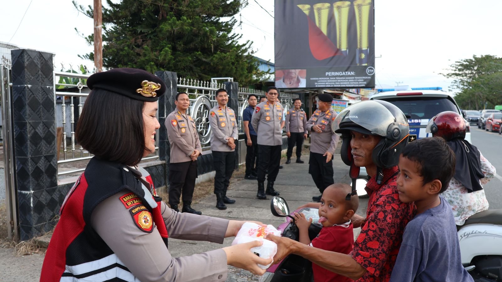 Pembagian takjil ini menyasar masyarakat yang masih berada di perjalanan menjelang waktu berbuka puasa, sebagai bentuk kepedulian dan kehadiran Polri di tengah-tengah masyarakat.